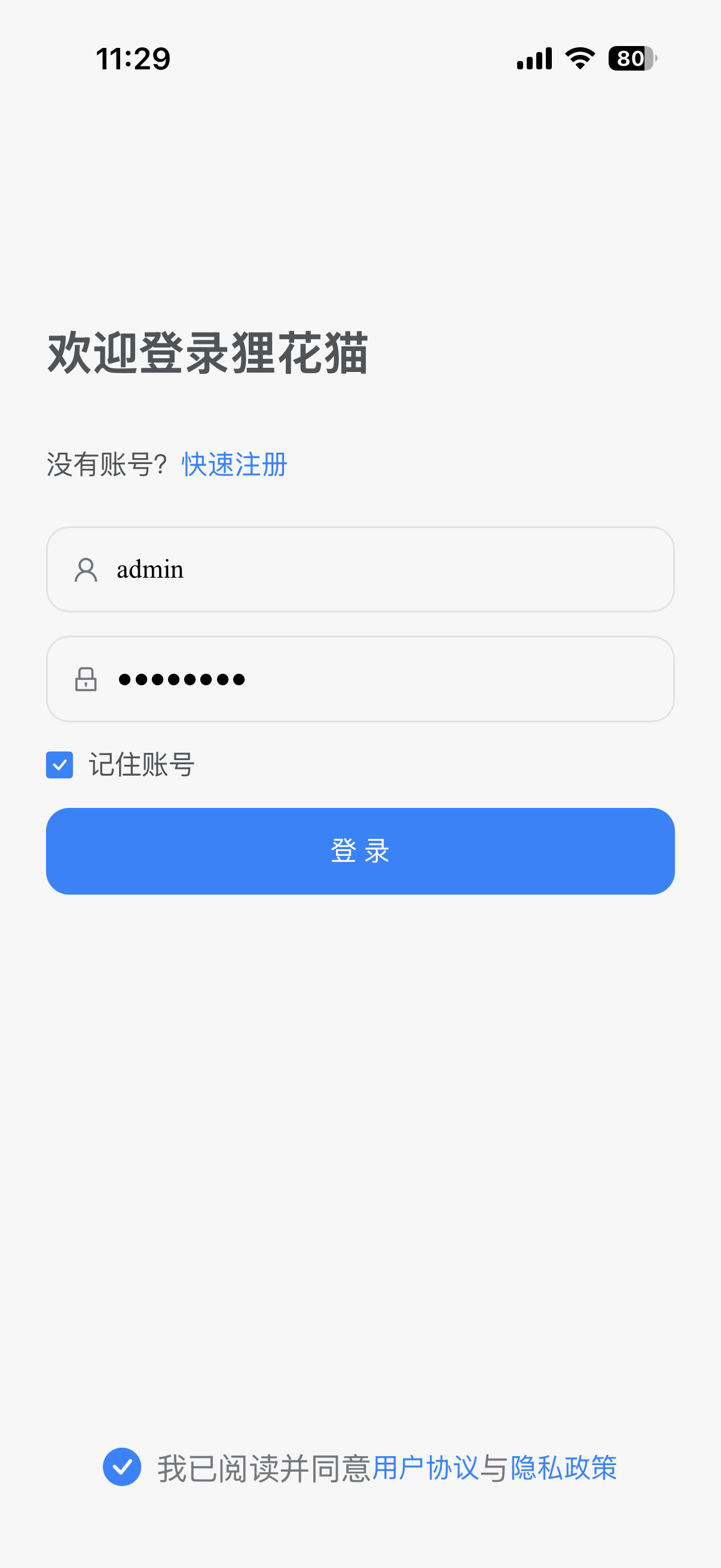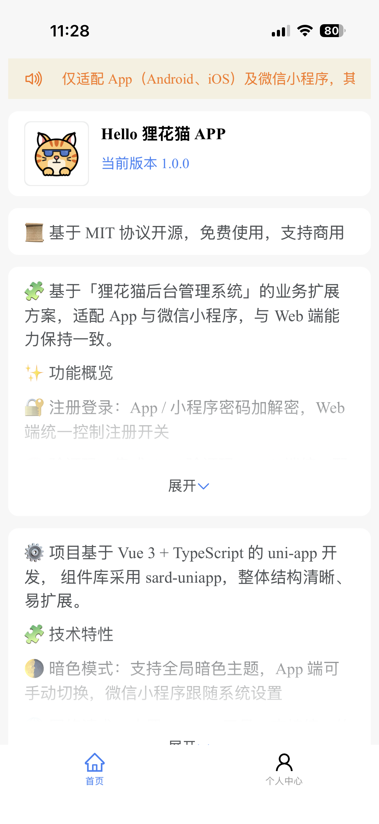 基于「狸花猫后台管理系统」的业务扩展方案,使用 uni-app 开发,适配 App 与微信小程序,并与 Web 端能力保持一致。